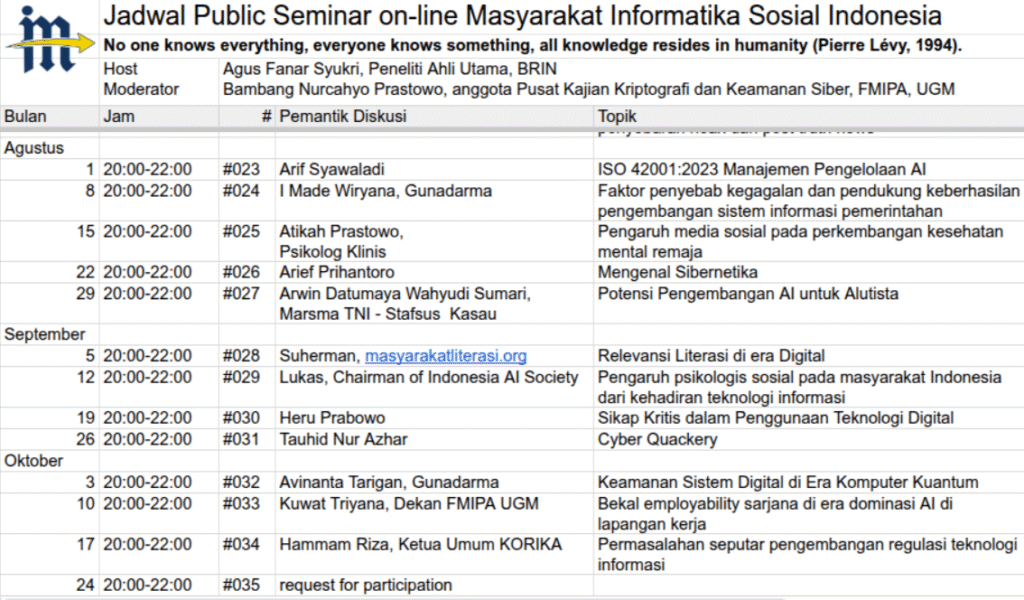 Awal tahun 2025, bersama Bambang Nurcahyo Prastowo, penulis buku “Informatika Sosial: Mengendalikan Teknologi untuk Tatanan Sosial yang Lebih Baik,” yang bergabung ke group chat MISI di pertengahan mas pandemi, Agus Fanar Syukri berkenan menjadi host Webinar yang diselenggarakan rutin tiap Jum’at malam pukul 20:00 WIB.