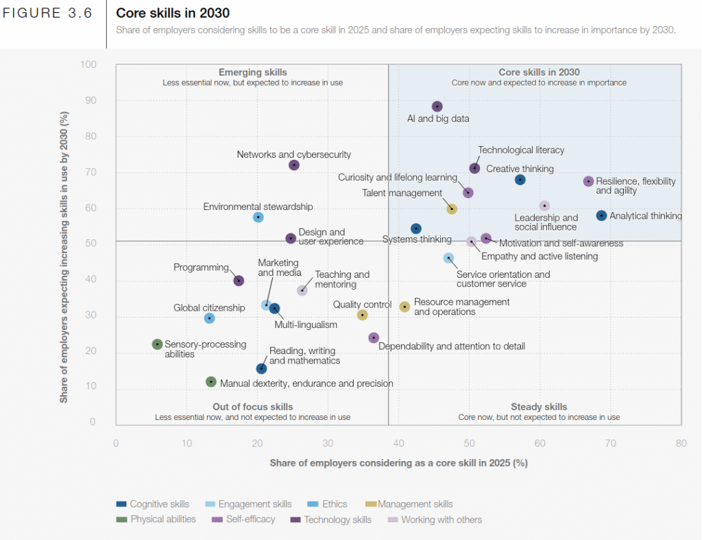 Membaca grafik yang dibuat World Economics Forum ini , banyak pengelola berbagai institusi bisnis menghendaki ketrampilan dengan berbagai macam istilah yang kesemuaan masuk dalam salah satu (atau semuanya) dari kategori ketrampilan membaca, menulis dan berhitung.
