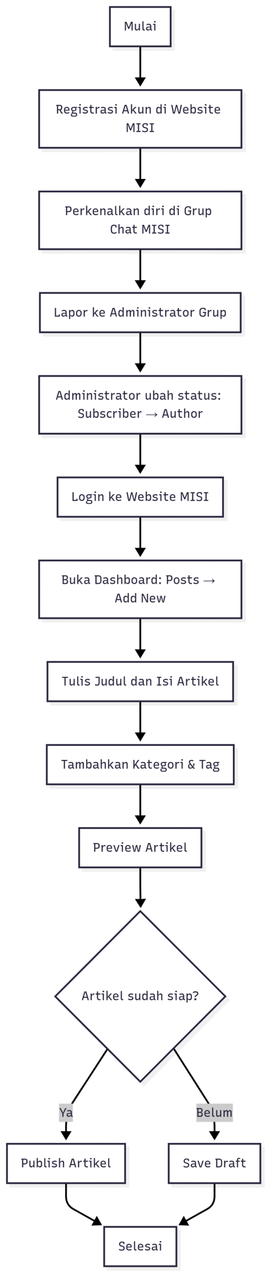 Agar setiap anggota dapat berkontribusi dengan mudah, kami menyusun panduan sederhana ini. Panduan ini berisi langkah-langkah mulai dari pendaftaran akun, aktivasi peran sebagai penulis (Author), hingga proses menulis dan mempublikasikan artikel di website MISI.
